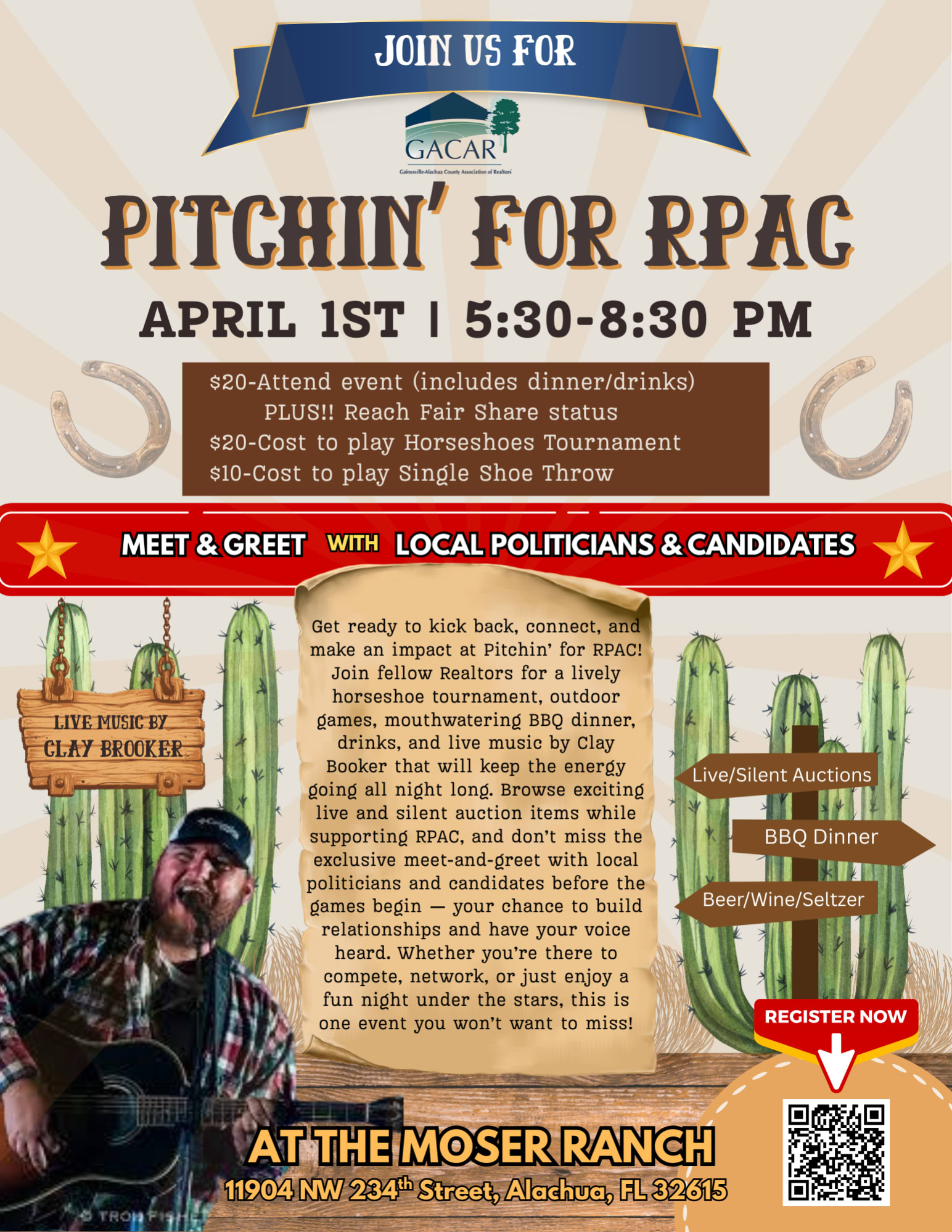 Get ready to kick back, connect, and make an impact at Pitchin’ for RPAC — an unforgettable evening where friendly competition meets a great cause! Join fellow Realtors for a lively horseshoe tournament, cornhole games, mouthwatering BBQ dinner, beer and wine, and live music by Clay Booker that will keep the energy going all night long. Browse exciting live and silent auction items while supporting RPAC, and don’t miss the exclusive meet-and-greet with local politicians and candidates before the games begin — your chance to build relationships and have your voice heard. Whether you’re there to compete, network, or just enjoy a fun night under the stars, this is one event you won’t want to miss!