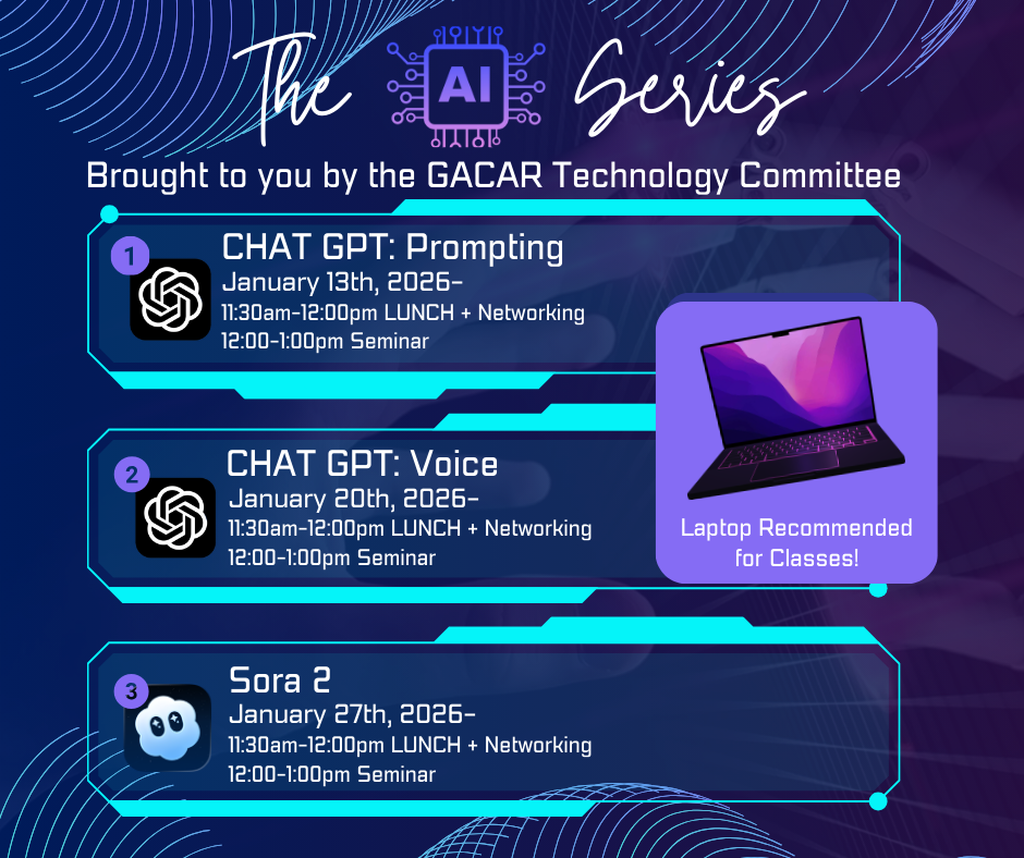 DESCRIPTION:📣 Introducing GACAR's 2026 AI Series!\nBrought to you by the GACAR Technology CommitteeReady to level-up your real estate business with the power of AI? Join us this January for a three-part AI workshop series designed to help GACAR members boost production\, streamline marketing\, and work smarter with the latest OpenAI tools.Each session includes lunch and networking from 11:30 AM to 12:00 PM\, followed by a focused workshop from 12:00 to 1:00 PM.🔹 Session Lineup📅 January 13\, 2026\nChatGPT: Prompting\nLearn techniques to generate clearer\, more powerful output\, perfect for listing descriptions\, market insights\, client communication\, and more.📅 January 20\, 2026\nChatGPT: Voice\nDiscover how to use ChatGPT's voice capabilities to speed up content creation\, respond on the go\, and enhance your daily productivity.📅 January 27\, 2026\nSora 2: Video Creation and Virtual Staging\nExplore cutting-edge AI video generation and learn how Sora 2 can create virtual staging\, dynamic listing videos\, neighborhood highlights\, and powerful marketing visuals.🎯 Why Attend?\nThese hands-on workshops are designed specifically for real estate professionals looking to integrate AI into their business for increased efficiency\, stronger marketing\, and improved client engagement.Join us for one\, or maximize your competitive edge and attend all three!\n*Event Attendance Policy*GACAR provides several educational and networking events throughout the year at no cost to its members. While they may be free\, registration is still required to ensure an accurate head count for food\, seating\, handouts\, etc. All "walk-ins" (anyone not registered 48 hours in advance) will be charged a $25 registration fee at the door.Cancellations must be made 48 hours in advance or be charged a $25 cancellation fee.